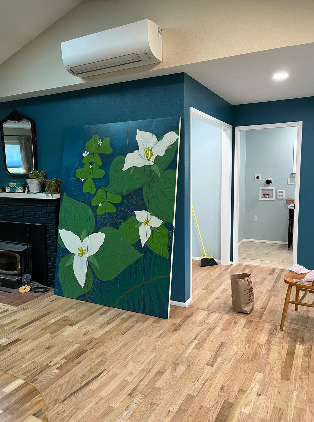 My studio was already set up for painting the mural panels I’d completed in the fall. With the opportunity to paint my own pantry doors, the idea for Painted Portals was born! I knew I wanted Trilliums, as I’ve been endlessly delighted with them for years. I used the blue and cream wall colors of my home, and combined some warm golds and greens. The result is an easy fit in my new dining area. I’m excited to paint more doorways and already have designs started.